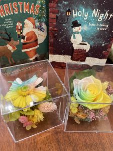 高学年は白のバラ、低学年は白のガーベラに自由に色をつけてもらい、まわりにあじさい、かすみ草、イモーテルなどの小花をあしらいクリアケースに入れて完成です。